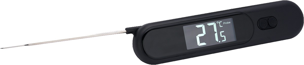 Probe reads internal food temperature measurement; temp range: -22F to 572F / -30C to 300C Foldable probe stores alongside the body Uses infrared for surface temperature measurement; temp range: -22F to 662F / -30C to 350C Uses two CR2032 cell battery (included) Waterproof and dustproof Compact storage design Fast temperature reaction for surface and internal readings. 0.75″ D x 6.875″ W x 1.5″ H