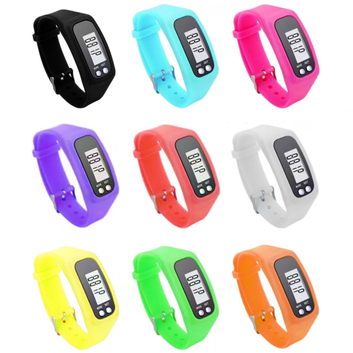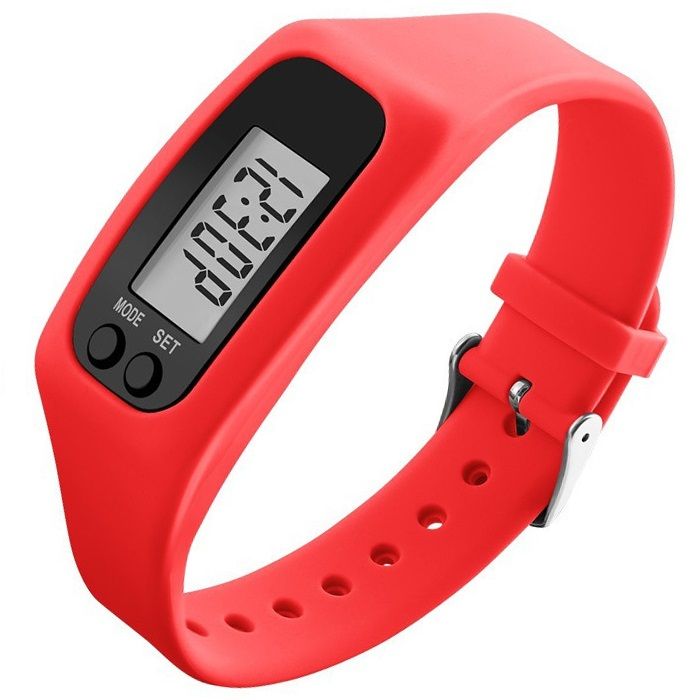 This silicone wrist pedometer functions as both a watch and a pedometer that can record steps, calories burned and distance. 9 3/4″ L x 1 1/8″ W